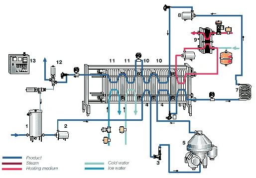 Les pasteurisateurs à plaques sont composés d'une série de plaques. Entre les plaques se trouvent des joints résistant à haute température. Ces joints empêchent les liquides passant à travers les plaques de se mélanger. Les plaques ont une épaisseur de 95 à 125 mm et sont en acier inoxydable. Les rainures sur les plaques permettent un remplissage turbulent, augmentent la surface de transfert de chaleur et prolongent le temps de contact du liquide avec la chaleur.