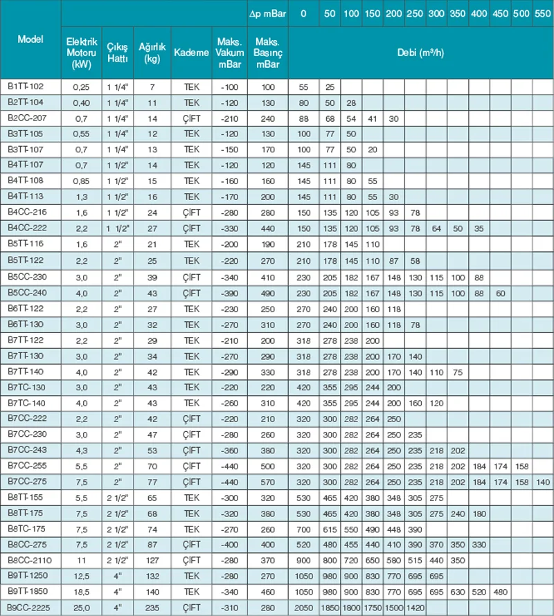 Le tableau ci-dessous montre le débit fourni par les différents modèles de blowers en fonction de différentes puissances de moteur.
